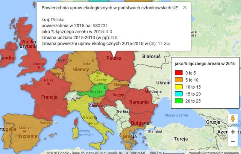 Na poziomie UE, obszar przeznaczony do produkcji upraw ekologicznych od 2010 do 2015 roku wzrósł o 21 proc.