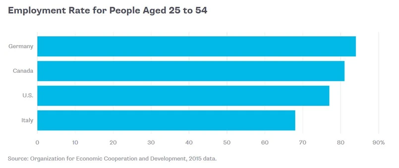 Jeśli przyjrzymy się odsetkowi osób w wieku 25-54 lata, które mają pracę, to okaże się, że USA biją na głowę Włochy, ale same znajdują się dopiero na trzecim miejscu – po Niemczech i Kanadzie.