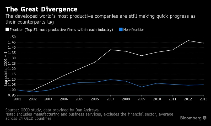 - W gospodarce dzieje się coś, co zwiększa różnicę w poziomie produktywności największych firm i reszty – mówi Dan Andrews, analityk OECD badający zagadnienie produktywności. – Najważniejsze pytanie brzmi: jaki mechanizm stoi za tym zjawiskiem i co rządy mogą zrobić, by je zatrzymać? – dodaje.