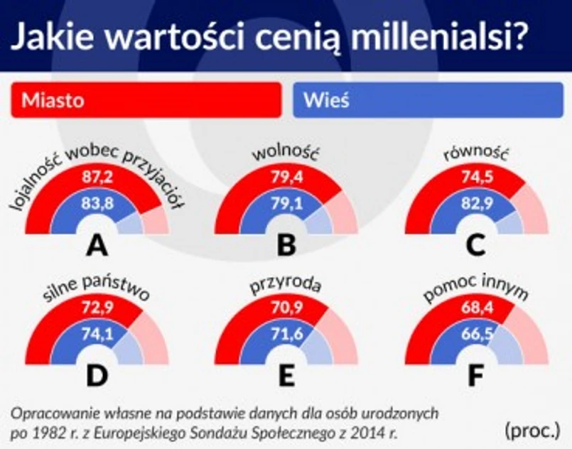 Młodzi Polacy różnią się także między sobą. Dla tych, którzy mieszkają na terenach wiejskich, ważniejsze niż dla osób z miasta są równość i sprawiedliwość (różnica 8,4 pkt. proc.), bezpieczeństwo (różnica 13,4 pkt. proc.) oraz tradycja (8 pkt. proc.). Dla tych z miast ważniejszy jest sukces, kreatywność, podziw (różnica aż 6,2 pkt. proc.). Dla młodych ze wsi istotniejsza jest za to skromność (różnica 5,1 pkt. proc.), mniej ważne jest szukanie przygód (choć przyjemności akurat nie) oraz bogactwo i dobra zabawa.