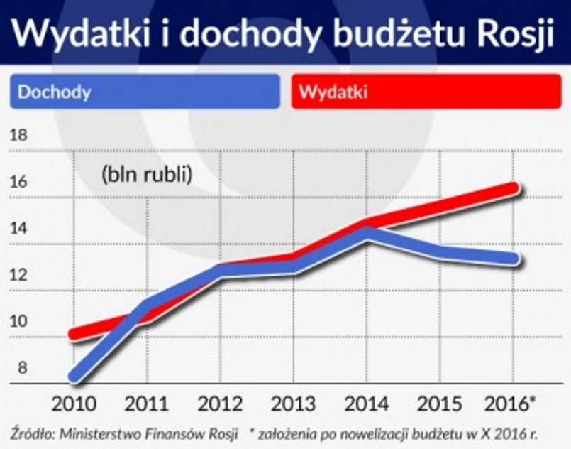W nowelizacji budżetu na rok 2016 dokonanej w październiku nie tylko nie zredukowano wydatków, ale nastąpiło dalsze ich zwiększenie z niecałych 16,1 bln rubli do przeszło 16,4 bln rubli. W efekcie deficyt z planowanych 3 proc. PKB (2,36 bln rubli) wzrósł do 3,7 proc. PKB (3 bln rubli), a według przewidywań na koniec roku może osiągnąć 3,9 proc. PKB.