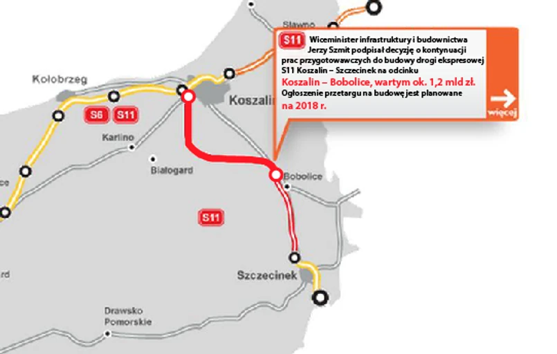 Budowa drogi S11 na odcinku węzeł Koszalin Zachód (bez węzła) - węzeł Bobolice o długości 47,7 km została wpisana do Programu Budowy Dróg Krajowych na lata 2014-2023 (z perspektywą do 2025 r.). Zadanie to ma być realizowane w systemie Projektuj i Buduj. Wartość kosztorysowa inwestycji to 1,2 mld zł. Ogłoszenie przetargu jest planowane na 2018 rok, a budowa powinna rozpocząć się w 2020 r., podano również.