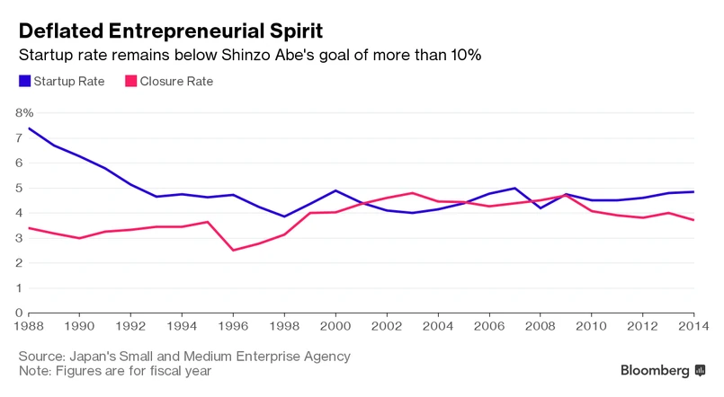W 2014 roku w rankingu Global Entrepreneurship Monitor w kategorii „aktywność we wczesnym stadium przedsiębiorczości”, Japonia znalazła się w ogonie zestawienia uwzględniającego ponad 70 państw. Jednocześnie w kategorii „strach przed bankructwem” odnotowała drugi najwyższy wynik.
