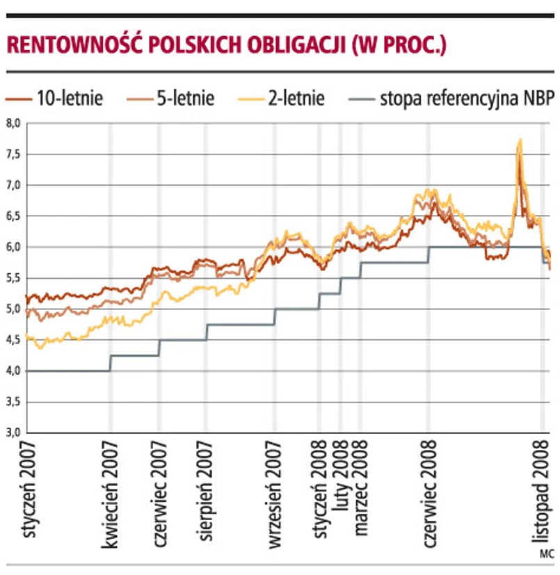 Marcin Mróz, ekonomista Fortis Banku, szacuje, że jeśli nadal będzie się oddalać perspektywa wejścia Polski do strefy euro, a dynamika PKB w 2009 roku spadnie do 3 proc. lub niżej, na koniec przyszłego roku stopa referencyjna może spaść do 4 proc. Na cyklu obniżek stóp skorzystać mogą fundusze, które mają obligacje o stałym oprocentowaniu i długim okresie zapadalności. Przy spadku stóp ich ceny rosną najbardziej.