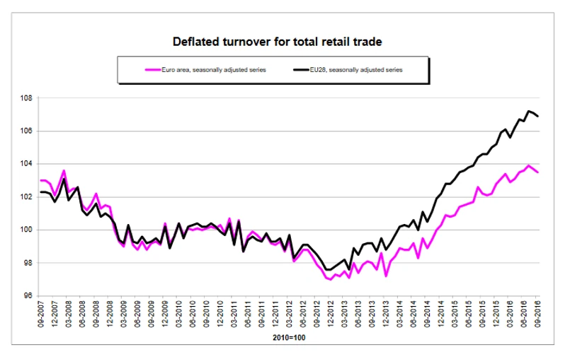 Sprzedaż detaliczna wyrównana sezonowo w strefie euro spadła o 0,2 proc. miesiąc do miesiąca we wrześniu 2016 r., podał unijny urząd statystyczny Eurostat. W całej Unii Europejskiej sprzedaż detaliczna spadła także o 0,2 proc. miesiąc do miesiąca. Konsensus rynkowy dla strefy euro wynosił 0,3 proc. spadku w ujęciu miesięcznym.
