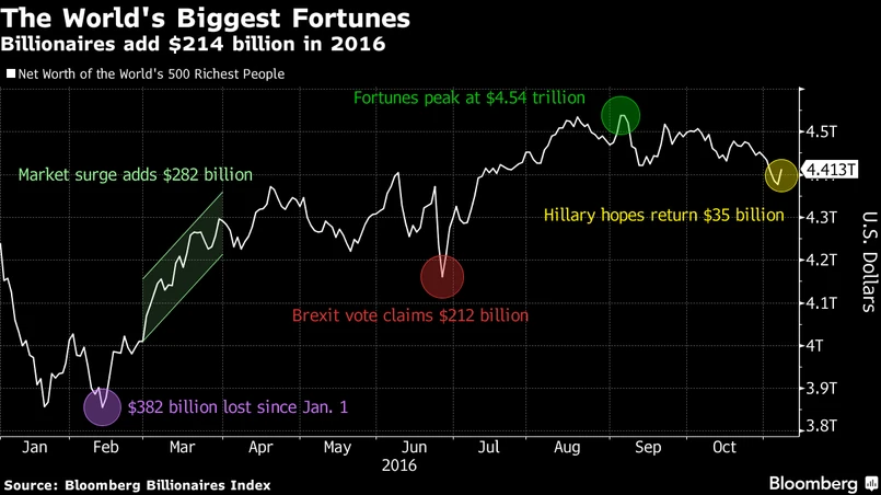 Najwięcej na przedwyborczych spekulacjach zyskali biznesmeni ze szczytu listy najbogatszych. Założyciel Amazona Jeff Bezos zarobił 2,6 mld dol. Warren Buffet dodatkowe 1,5 mld dol.
