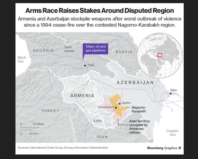 Armenia kupiła rosyjskiej produkcji rakiety balistyczne Iskander. Azerbejdżan z kolei twierdzi, że testuje wojskowe drony współprodukowane przez Izrael i prowadzi rozmowy z Pakistanem ws. zakupu zaawansowanej technologicznie broni.