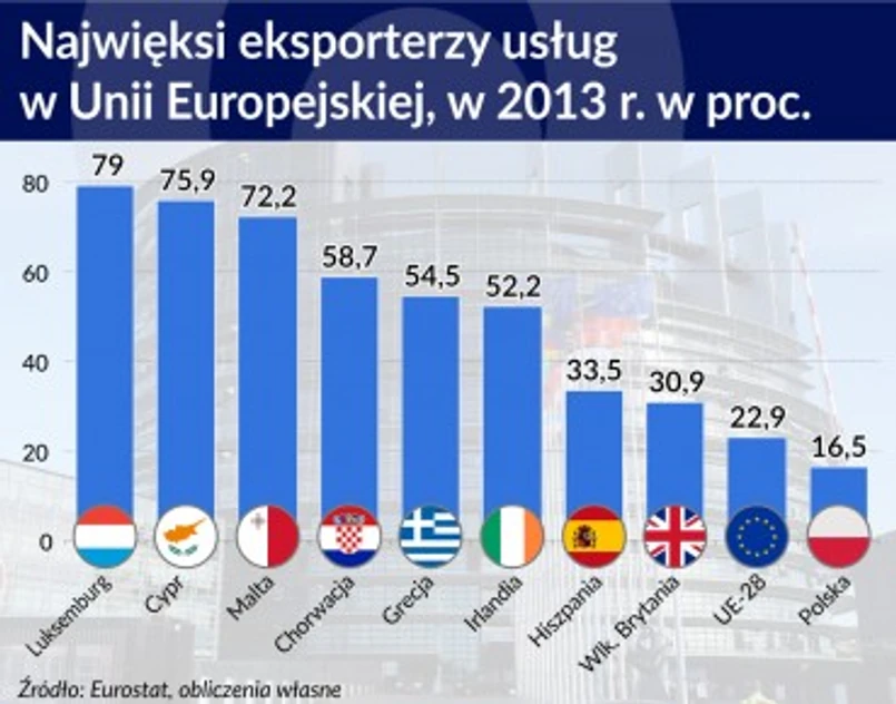 Produktywność usług rośnie wolno, co wynika w dużej mierze z mało intensywnej konkurencji, którą ograniczają utrzymujące się bariery. Usługi mają największy udział w obrotach handlowych w Luksemburgu (79 proc. eksportu), na Cyprze (75 proc.) i Malcie (72 proc.). Niemcy, które są największym w Unii eksporterem mają w handlu usługami wewnątrz Unii bilans ujemny. W przypadku Polski usługi stanowią 16,5 proc. eksportu towarów i usług, co stawia nas poniżej średniej unijnej.