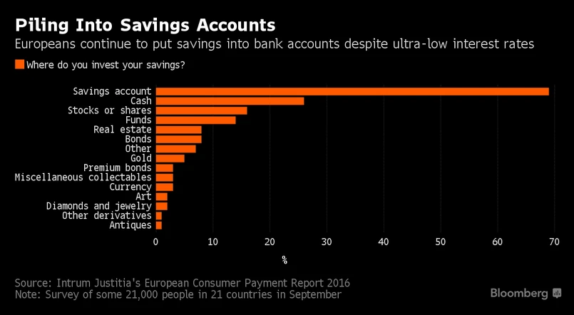 Z badania wynika, że 69 proc. Europejczyków umieszcza oszczędności na rachunkach bankowych. Opiera się ono na danych zebranych we wrześniu od 21 tys. osób z 21 krajów.
