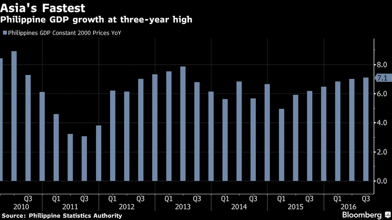 Filipiny wykazują coraz większą odporność na takie czynniki zagrożenia jak protekcjonistyczne ambicje prezydenta-elekta Donalda Trumpa czy tyrady prezydenta Rodrigo Duterte przeciw USA. Z prognoz ekonomistów wynika, że gospodarka Filipin będzie rozwijać się w tempie ponad 6 proc. rocznie do 2018 roku. Dzięki temu uplasuje się w czołówce najszybciej rozwijających się krajów świata. Pod względem wzrostu gospodarczego w trzecim kwartale Filipiny przegoniły Chiny (tutaj PKB wzrósł o 6,7 proc.) i Wietnam (6,4 proc.).