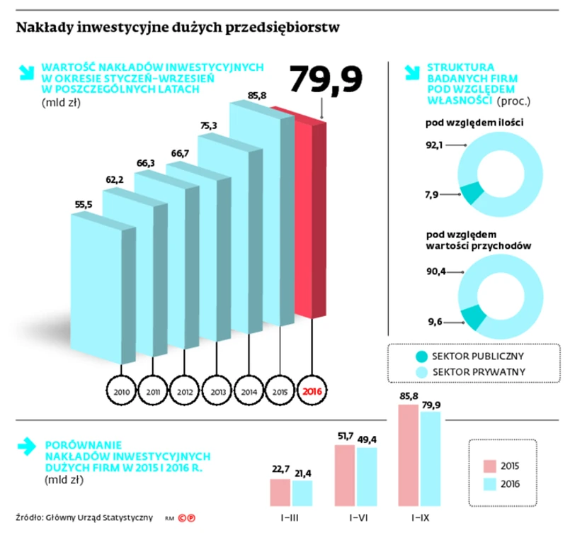 W sumie od początku stycznia do końca września przedsiębiorcy zatrudniający 50 osób i więcej zainwestowali 79,9 mld zł. Takie dane podał wczoraj GUS w raporcie o wynikach przedsiębiorstw niefinansowych. Licząc w cenach stałych, wartość wydatków firm w tym zakresie zmalała o 9,1 proc. Co gorsza, spadek cały czas się pogłębia. Po pierwszym półroczu nakłady były mniejsze o niewiele ponad 7 proc.