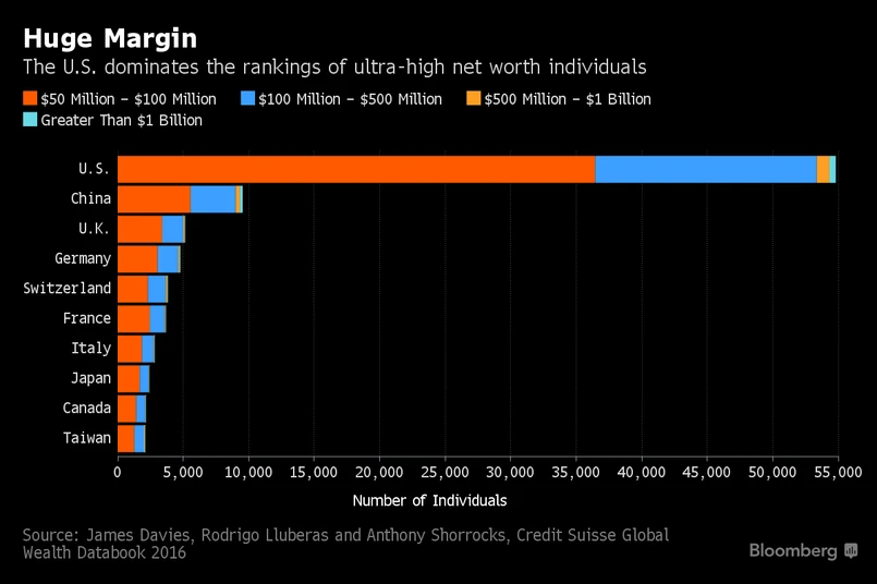 Jeśli chodzi o kraje bezkonkurencyjne są USA, w których żyje około połowa ultrabogatych. Następne na tej liście są Chiny, Wielka Brytania, Niemcy i Szwajcaria.