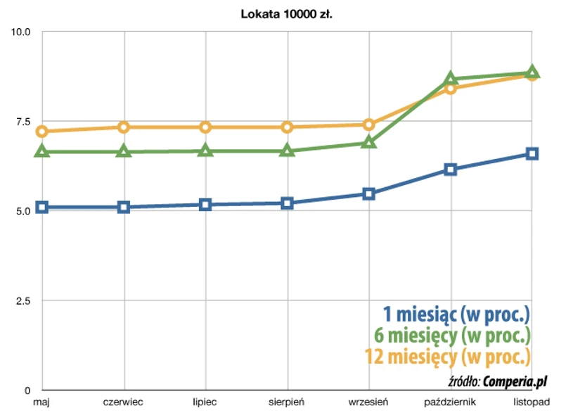 Zresztą z zestawienia Comperii tę tendencję dobrze już widać. Dla lokat w wysokości 1000 zł średnie oprocentowanie depozytu 12 miesięcznego nadal jest wyższe niż dla lokat 1 i 6 miesięcznych (odpowiednio 8,67 proc, 6,31 proc. i 8,42 proc.), a największy skok ceny dla tysiączłotowych depozytów 6 i 12 miesięcznych widać było (w zestawieniu od maja) między wrześniem a październikiem (ok.1,5 pkt. proc.). Wzrost oprocentowania między październikiem a listopadem był już mniejszy.