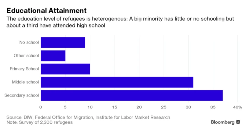 To wartości sporo odbiegające od standardów dla niemieckiej populacji. 88 proc. obywateli naszego zachodniego sąsiada ma na swoim koncie 10 albo więcej lat nauki – wśród uchodźców odsetek ten sięga 58 proc. Wartość ta jest jednak wyższa od prognoz ekspertów, którzy obawiali się u uchodźców znacznie uboższej edukacyjnej bazy. Koresponduje także z kontrowersyjną wypowiedzią rektora Uniwersytetu w Hamburgu, że według zestandaryzowanych testów dwie trzecie nowych przybyszów jest w zasadzie analfabetami.