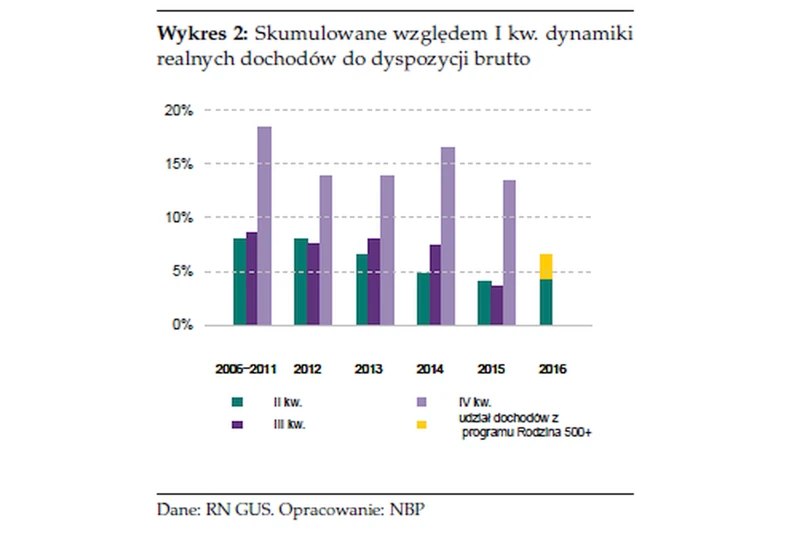 W II kw. 2016 r. realne dochody sektora gospodarstw domowych zwiększyły się o 6,1% r/r oraz z czego za ok. 2,5 pkt proc. wzrostu odpowiadają wypłaty ze świadczeń Rodzina 500+. Ponadto, korzystna dynamika dochodów była wspierana przez wyraźny wzrost dochodów z pracy najemnej oraz nadwyżki operacyjnej brutto. Wartość dochodów obniżały natomiast szybko rosnące składki na ubezpieczenia społeczne, związane m. in. z oskładkowaniem umów cywilno-prawnych, podał też bank centralny.