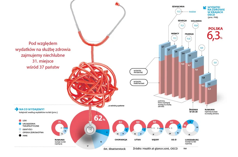 Takie wyniki plasują nas na siódmym miejscu od końca wśród 37 przebadanych państw OECD. I choć to subiektywna ocena, to autorzy najnowszego raportu „Health at a Glance 2016” wskazują, że najczęściej idzie w parze z obiektywnymi przyczynami. I rzeczywiście: dane przedstawione w kolejnej edycji badania potwierdzają tę tezę. Jednym ze wskaźników branym pod uwagę jest dostęp do leczenia – a z tym jest u nas fatalnie. Pod względem nakładów na służbę zdrowia zajmujemy jedno z ostatnich miejsc. Przeznaczamy na ten sektor tylko 4,5 proc. PKB, podczas gdy średnia unijna wynosi 7,8 proc.