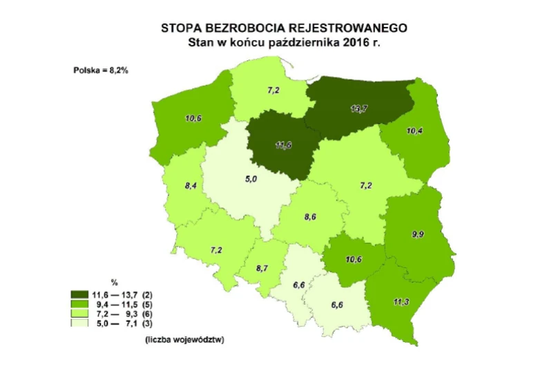 Jak wynika z danych GUS, Stopa bezrobocia rejestrowanego w województwach kształtowała się w granicach od 5,0 proc. w wielkopolskim do 13,7 proc. w warmińsko-mazurskim. W porównaniu z wrześniem wskaźnik ten spadł w większości województw (w granicach 0,2 p.proc. – 0,1 p.proc.), z wyjątkiem lubelskiego, lubuskiego, warmińsko-mazurskiego i zachodniopomorskiego - tutaj pozostał na tym samym poziomie.