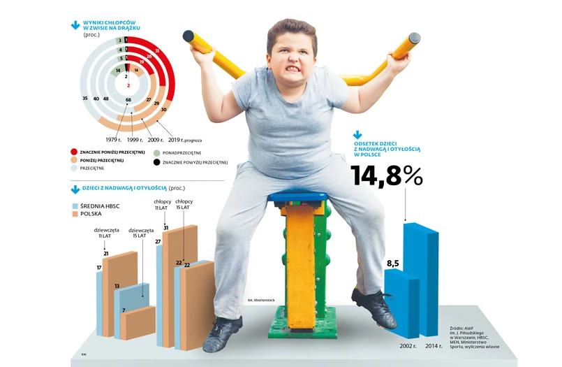 Słabe rezultaty sportowe nie powinny dziwić – z badania HBSC (międzynarodowe testy przeprowadzone w 42 krajach analizujących zachowania zdrowotne i styl życia nastolatków) wynika, że co piąte dziecko w Polsce już w wieku 15 lat ma nadwagę lub jest otyłe. Coraz mniej nastolatków ćwiczy na lekcjach wychowania fizycznego: w 2014 r. co 10. gimnazjalista miał długotrwałe zwolnienie lekarskie.