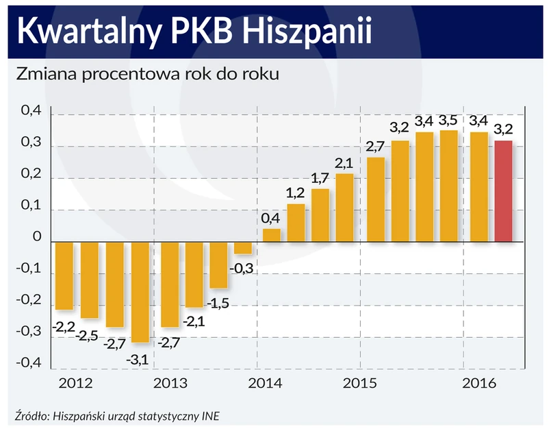 W Hiszpanii w pierwszych dwóch kwartałach 2016 roku PKB wzrósł odpowiednio o 3,4 oraz 3,2 proc. Dane za trzeci kwartał będę dostępne 24 listopada.