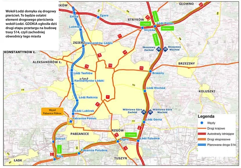 Po zbudowaniu tej trasy na drogowej mapie Polski Łódź będzie wyglądała, jakby była ważniejsza od Warszawy. Na wielkim węźle Łódź Północ spotykają się już dziś autostrady A1 i A2. Żeby przybliżyć szybkie drogi ekspresowe do Łodzi, decydenci zdecydowali przed laty, że trasa S8 pobiegnie z Warszawy w stronę Wrocławia z charakterystycznym uskokiem: w rejonie Piotrkowa Trybunalskiego kierowcy muszą zjeżdżać na A1, żeby potem znów wrócić na S8. A teraz do tej układanki w ciągu czterech lat dołączy jeszcze trasa S14.