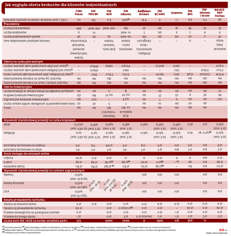 Dlatego w ostatnich latach liczba brokerów spada (niedawno pojawiły się nieoficjalne informacje, że na zamknięcie domu maklerskiego w Polsce zdecydował się Deutsche Bank),w ramach oszczędności domy maklerskie włączane są w struktury banków. Taką operację w ramach grupy kapitałowej przeprowadziły Bank Zachodni WBK, ING Bank Śląski, a także mBank. To nie znaczy, że konkurencja osłabła, a brokerzy przestali walczyć o tych klientów, którzy wciąż chcą inwestować na giełdzie. W zależności od pozycji na rynku robią to w różny sposób.