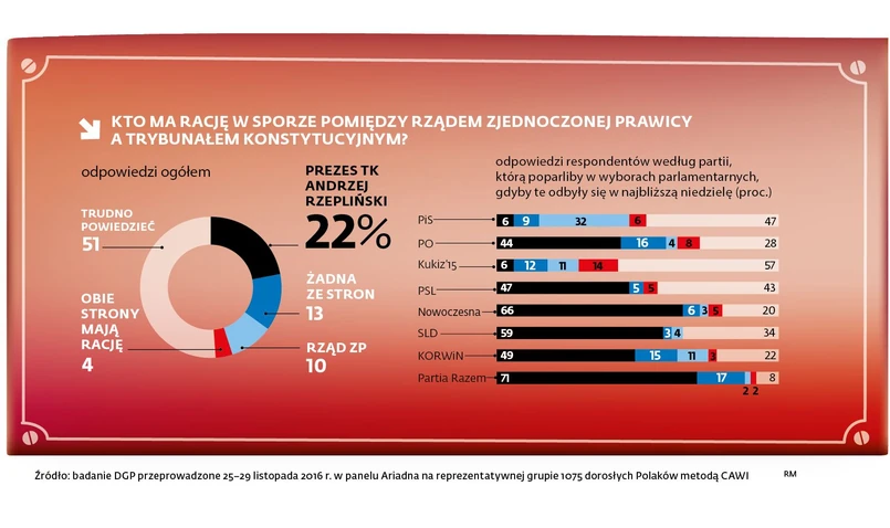 Pochodną tego są także odpowiedzi na pytanie, kto ma rację w sporze. Ponad połowa pytanych nie ma na ten temat żadnego zdania. Niespełna 22 proc. przyznaje rację prezesowi Andrzejowi Rzeplińskiemu. 13 proc. uważa, że żadna ze stron nie ma racji, a 10 proc. oddaje ją rządowi.