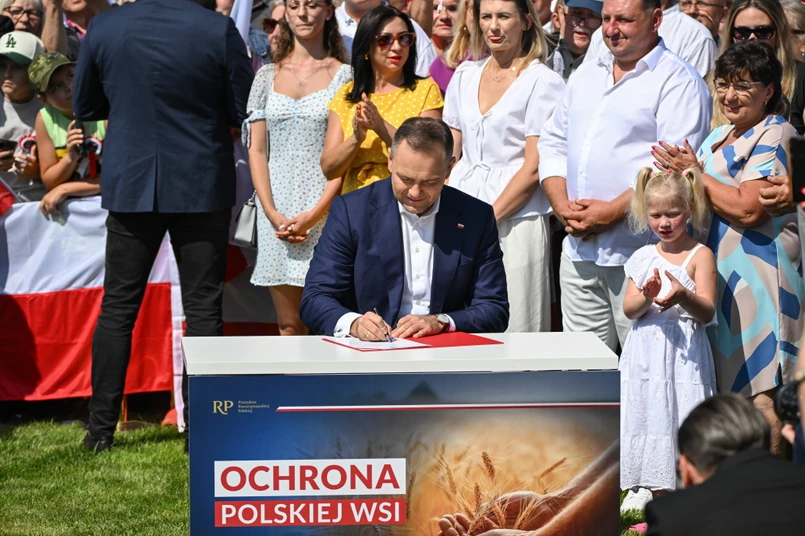 Poinformował, że w swoim projekcie ustawy odnosi się do wygasającego w 2026 r. moratorium na sprzedaż ziemi, należącej do Zasobu Własności Rolnej Skarbu Państwa. - Ustawa o ochronie polskiej wsi wzywa większość parlamentarną, aby przedłużyć moratorium na zakaz sprzedaży polskiej ziemi i to dzisiaj podpisałem – powiedział prezydent.