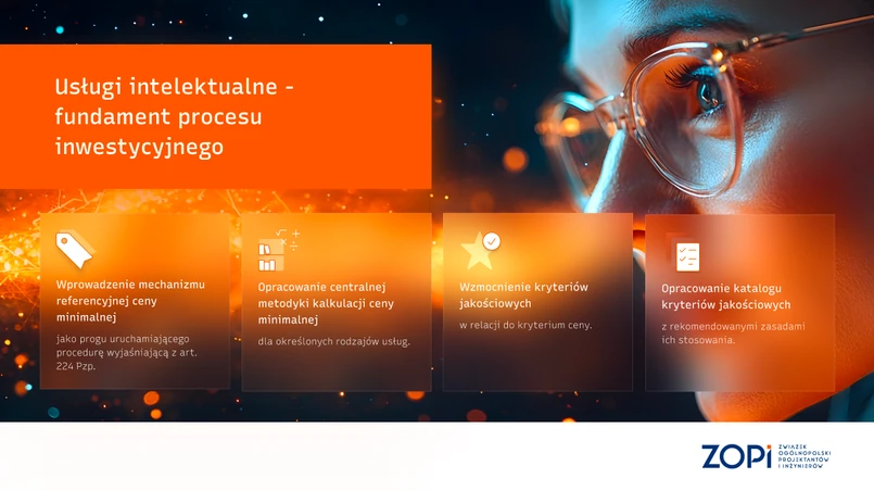 ZOPI skierował do administracji państwowej, w tym do Ministerstwa Infrastruktury, Prezesa Urzędu Zamówień Publicznych oraz Prezesa Prokuratorii Generalnej RP, pismo dotyczące konieczności wprowadzenia systemowych rozwiązań w zakresie wyceny usług intelektualnych w zamówieniach publicznych. Związek wskazuje, że obecny model, oparty głównie na kryterium ceny oraz utrwalonych praktykach przetargowych, nie uwzględnia specyfiki usług wymagających wiedzy i doświadczenia, a jego skutki widoczne są na wszystkich etapach procesu inwestycyjnego. Jednocześnie ZOPI przedstawia konkretne propozycje rozwiązań ograniczających zjawisko rażąco niskich cen i wzmacniających realne kryteria jakościowe.