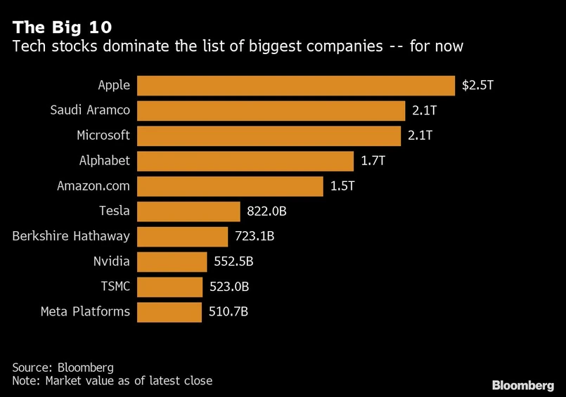 Aż 8 z 10 firm o najwyższej wartości rynkowej to spółki technologiczne (jeżeli zastosujemy szeroką definicję i za taką uznamy producenta pojazdów elektrycznych – Teslę). Pozycja lidera, którą dzierży Apple, jest jednakże zagrożona przez naftowego potentata Saudi Aramco, który mocno korzysta na gwałtownym wzroście cen ropy naftowej, a Tesla wypadła z klubu „bilionerów” – jej wartość spadła do 822 mld dol. Meta, czyli właściciel Facebooka, w ogóle zagrożona jest wypadnięciem z pierwszej dziesiątki zestawienia. Z elity wypadło chińskie Alibaba Group.