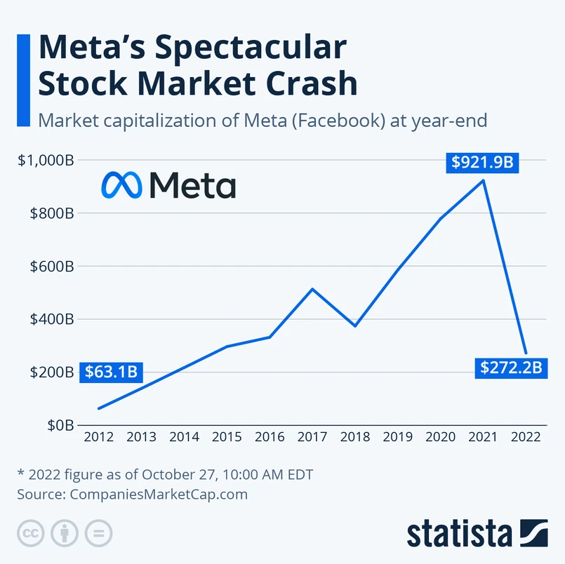 Pod koniec 2021 roku kapitalizacja rynkowa Mety (a jeszcze niedawno Facebooka) wynosiła blisko 922 mld dol. Dziś to zaledwie około 272 mld dol., co oznacza spadek na poziomie 70 proc. w mniej niż rok.