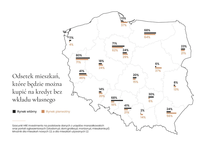 W skali całego kraju, gdyby wspomniany rządowy program ruszył już dziś, to w całej Polsce zakwalifikowałoby się do niego 31% mieszkań używanych i tyle samo mieszkań nowych wystawionych na sprzedaż – wynika z szacunków HRE Investments.