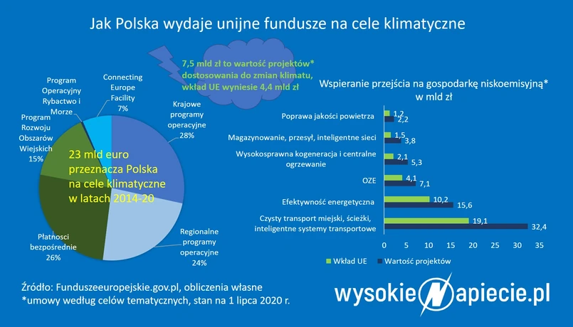 Zgodnie z założeniami zawartymi w Umowie Partnerstwa na lata 2014-2020, Polska przeznacza 20 proc. środków na cele klimatyczne. To uśredniona wartość w ramach realizacji programów operacyjnych Polityki Spójności, Programu Rozwoju Obszarów Wiejskich, Programu Operacyjnego Rybactwo i Morze, instrumentu Connecting Europe Facility oraz I filara Wspólnej Polityki Rolnej. Ogólna kwota przeznaczona na cele klimatyczne w obecnej perspektywie wynosi ok. 23 mld euro. Do unijnych pieniędzy dochodzi jeszcze krajowe współfinansowanie.