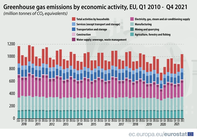Emisje gazów cieplarnianych w gospodarce Unii Europejskiej w czwartym kwartale 2021 r. wzrosły o 8 proc. w porównaniu z tym samym kwartałem 2020 r. Wzrost ten wynika w dużej mierze z ożywienia gospodarczego po gwałtownym spadku aktywności w 2020 r., spowodowanym kryzysem Covid-19. Dla porównania emisje za ten sam okres w 2019 r. wyniosły 1,005 mld ton ekwiwalentu CO2.