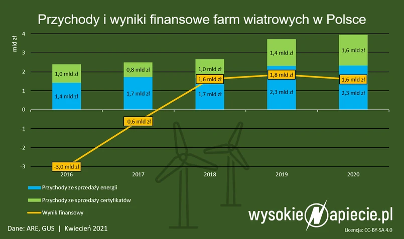 Natomiast już w 2016 roku blisko 70% wszystkich farm wiatrowych w Polsce znalazło się pod kreską. Banki (głównie kontrolowane przez polski Skarb Państwa) musiały pogodzić się ze stratami na udzielonych im kredytach. Wówczas część spółek wiatrowych zbankrutowała, a kilka innych zostało przejętych przez zamożnych i cierpliwych inwestorów, takich jak Green Investment Group z australijskiej grupy Macquarie. Cały podsektor przyniósł w 2016 roku niemal 3 mld zł strat. Rok później sytuacja była tylko nieco lepsza − strata przekroczyła 0,6 mld zł. Dopiero przez ostatnie trzy lata farmy wiatrowe notują zyski brutto w granicach 1,6-,1,8 mld zł rocznie.