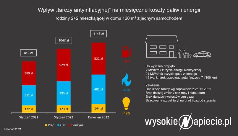 W praktyce istotne znaczenie dla portfeli Polaków będzie mieć jedynie czasowa obniżka podatku VAT na gaz ziemny i energię elektryczną. Dzięki nim w kieszeni przeciętnej rodziny pozostanie o 100 zł więcej, niż gdyby rząd nie podjął żadnych działań, ale ta zmiana ma obowiązywać tylko przez trzy miesiące. Przez ten czas z kieszeni Kowalskich i tak będzie uciekać o 200 zł więcej miesięcznie niż na początku tego roku, a od kwietnia portfel przeciętnej polskiej rodziny będzie uszczuplać się już o ok. 300 zł/m-c.