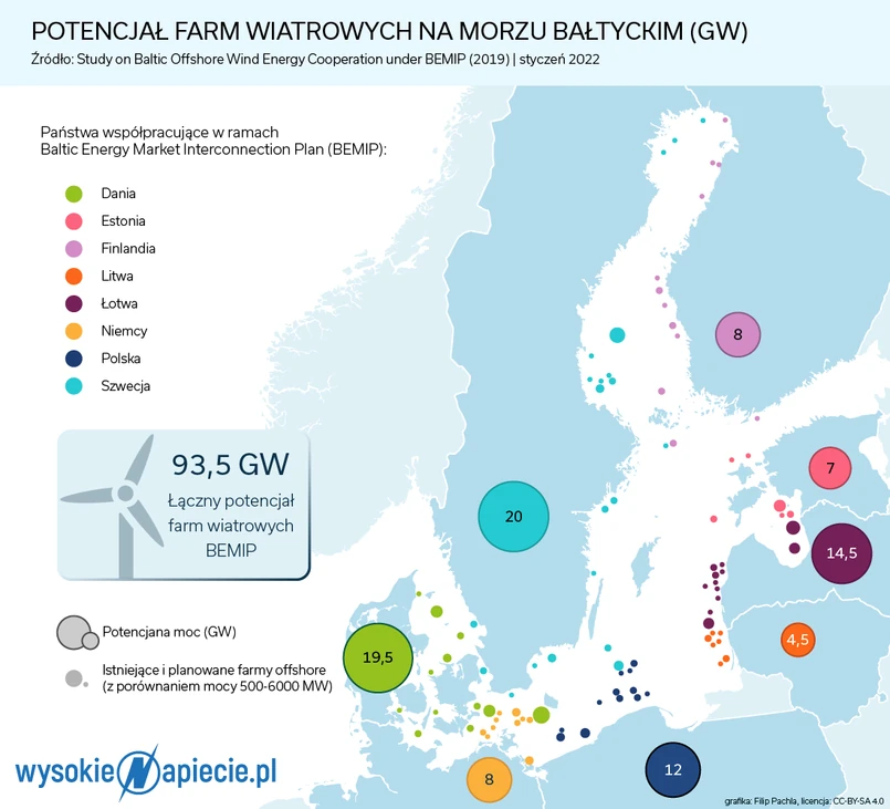 W Europie moc energetyki wiatrowej na morzach wynosi około 26 GW, z czego większość znajduje się na Morzu Północnym. Na Bałtyku pracują elektrownie wiatrowe o mocy ok. 2,8 GW, natomiast potencjał tych wód jest oceniany na dużo większy. Do 2050 roku Bałtyk może pomieścić aż 93 GW w morskiej energetyce wiatrowej - oceniła trzy lata temu Komisja Europejska. Stowarzyszenie Wind Europe potencjał Bałtyku uwzględniający ekonomiczne warunki budowy farm wiatrowych offshore ocenił na 83 GW.