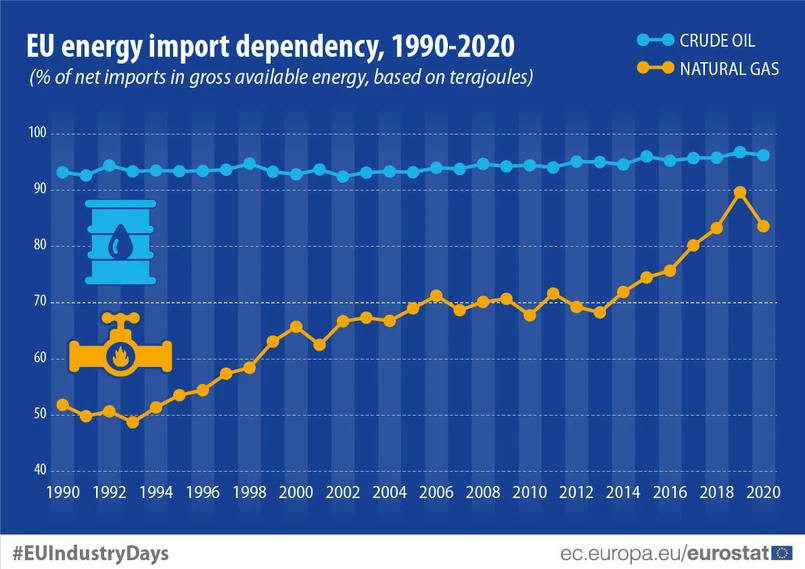 Gaz ziemny, główne paliwo do produkcji energii elektrycznej i ogrzewania w UE, był na drugim co do wielkości poziomie uzależnienia od importu, wynoszącym 83,6 proc. w 2020 r., co stanowi spadek o 6 punktów procentowych w porównaniu z 89,6 proc. z 2019 r.