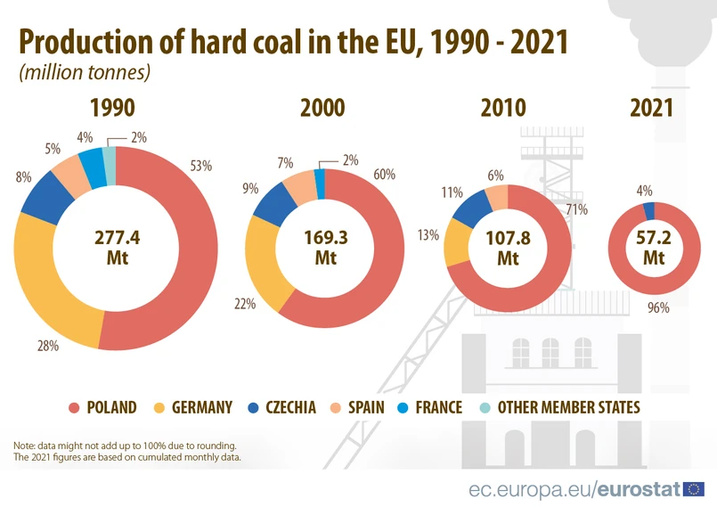 W 2021 r. UE wyprodukowała 57 mln ton węgla kamiennego (-79% w porównaniu do 1990 r.). Od tego czasu zmniejszyła się również liczba państw członkowskich produkujących węgiel kamienny z 13 w 1990 r. do zaledwie 2 w 2021 r. Ostatni producenci węgla w UE to Polska, która w ubiegłym roku odpowiadała za 96 proc. całkowitej produkcji węgla UE) oraz Czechy z 4 proc. udziałem w produkcji.