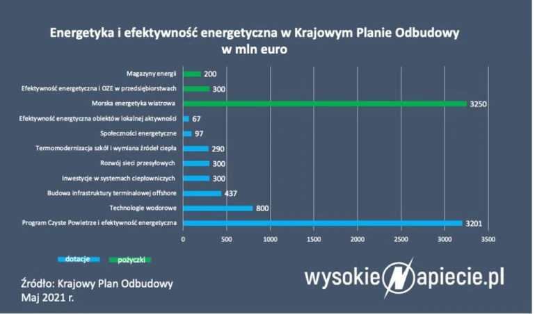 Na 800 mld euro w ramach Funduszu składają się dotacje i pożyczki. Polska wnioskowała o 23,9 mld euro dostępnych w ramach grantów i o 11,5 mld euro z części pożyczkowej. Transformacja energetyki to jeden z kluczowy elementów polskiego KPO.