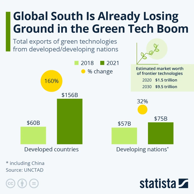 Jak pokazuje poniższy wykres, obie grupy krajów o wyższych i niższych dochodach w 2018 roku eksportowały zielone technologie o wartości około 60 miliardów dolarów. Ale zaledwie w trzy lata te dysproporcje znacząco urosły. Do 2021 roku kraje rozwinięte wyeksportowały zielone technologie o wartości ponad 156 miliardów dolarów (wzrost o 160 procent). Dla porównania eksport krajów rozwijających się wyniósł 75 miliardów dolarów (wzrost tylko o 32 procent). Autorzy raportu ostrzegają, że w miarę upływu czasu coraz trudniej będzie zlikwidować tę lukę, ponieważ gospodarki rozwinięte wykorzystują wiele dostępnych dla nich rozwiązań, pozostawiając w tyle gospodarki rozwijające się.