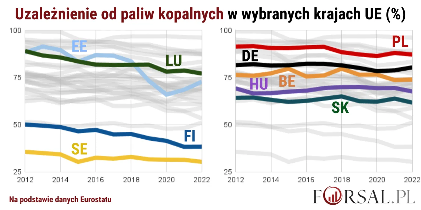 W niechlubnym gronie maruderów znalazły się także takie kraje jak Węgry, Belgia, Słowacja, Austria czy Polska. W latach 2012-22 uzależnienie spadło w naszym kraju o 4,25 p.p. czyli 4,7%. Choć tempo jest wyraźnie lepsze niż w przypadku Niemców (w całym XXI wieku było to u nas -10,6%), to nadal nasze uzależnienie jest wyższe niż u zachodniego sąsiada.