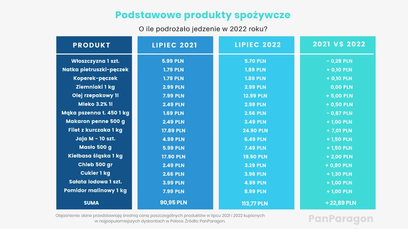 Droższe zakupy spożywcze stały się faktem, a skutki największej od 25 lat inflacji w Polsce da się odczuć przy każdej wizycie w sklepie. Potwierdzają to dane pochodzące z setek tysięcy paragonów największych dyskontów w Polsce. Specjaliści z aplikacji PanParagon przygotowali listę podstawowych artykułów spożywczych i porównali ich ceny z lipca 2021 oraz analogicznego miesiąca z 2022 roku.