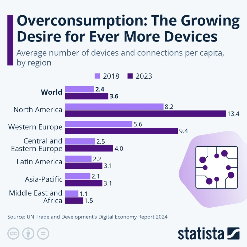 Dane z opublikowanego przez ONZ Digital Economy Report 2024 pokazują, że owo szybko rosnące zapotrzebowanie to nie tylko wypadkowa coraz większej liczby osób kupujących urządzenia elektroniczne na całym świecie, ale także rosnąca średnia liczba urządzeń na przypadających konsumenta. Jak pokazuje wykres Statisty, średnia liczba posiadanych urządzeń na mieszkańca na całym świecie wzrosła w latach 2018-2023 z 2,4 do 3,6.