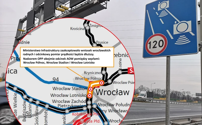 Teraz plan zakłada objęcie nadzorem OPP kolejnego fragmentu trasy A8 - od węzła Wrocław Stadion do węzła Wrocław Lotnisko, dzięki czemu kontrolą objętych będzie 8,4 km AOW. Na kontrolowanym odcinku kierowcy nie będą mogli jechać szybciej niż 120 km/h.