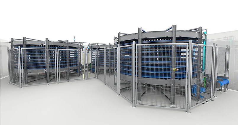 Przenośniki spiralne projektowane na indywidualne zamówienie klienta to urządzenia idealne do transportu, zamrażania, chłodzenia lub podgrzewania. Głównym zadaniem tych urządzeń jest transport produktów w pionie. Kluczowym elementem przenośnika jest specjalna taśma, która porusza się po spirali. Poprzez przeniesienie obrotu z motoreduktora spirala, obracając się, przenosi materiał znajdujący się na taśmie, przesuwając go w zadanym kierunku.