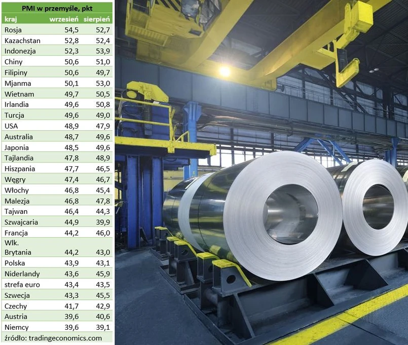 Przykładem jest Hiszpania, gdzie przemysłowy PMI wzrósł do 47,7 pkt z 46,5 pkt miesiąc wcześniej. Wzrost z 49 do 49,6 pkt zanotowano w przypadku Turcji. W trendzie spadkowym jest przemysł francuski. PMI dla tamtejszego przemysłu spadł do 44,2 pkt z 46 pkt miesiąc wcześniej. To jednak lepszy wynik niż wynikało ze wstępnych szacunków (43,6 pkt). W Szwajcarii przemysłowy PMI od początku roku jest poniżej poziomu 50 pkt, który oddziela ekspansję od recesji, ale we wrześniu nastąpił wzrost 39,9 do 44,9 pkt.