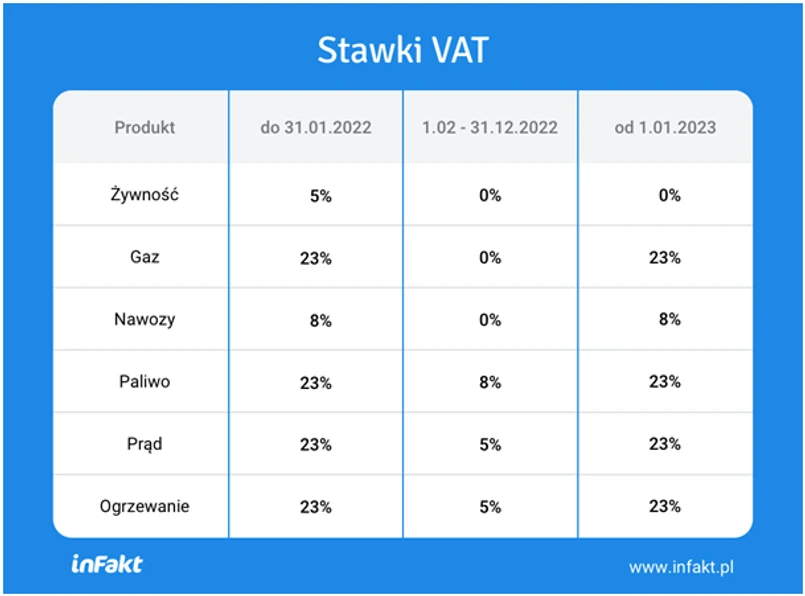 Powrót do pierwotnych stawek VAT będzie dla konsumentów oznaczał kolejny wzrost cen. Najbardziej odczuwalne będą one w przypadku gazu. Dziś obejmuje go zerowy VAT, ale już od 1 styczna 2023 r. będzie to 23%, więc ceny dla gospodarstw domowych mogą poszybować w górę. Rząd szykuje zamrożenie cen czy też zwrot części VAT, jednak nie będzie to rozwiązanie dostępne dla każdego – najprawdopodobniej zadecyduje kryterium dochodowe.