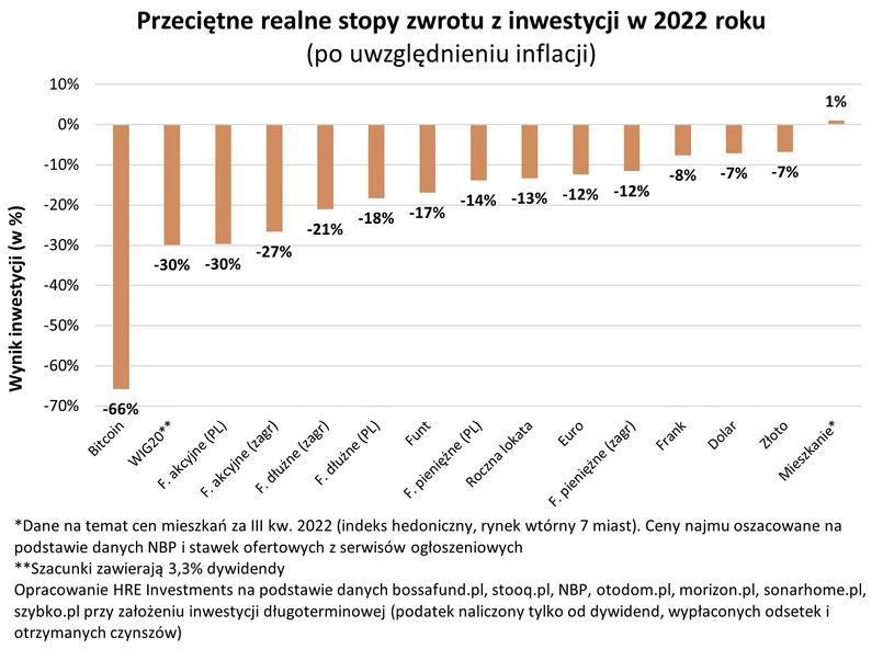 Przeciętne realne (po uwzględnieniu inflacji) stopy zwrotu z inwestycji w 2022 roku