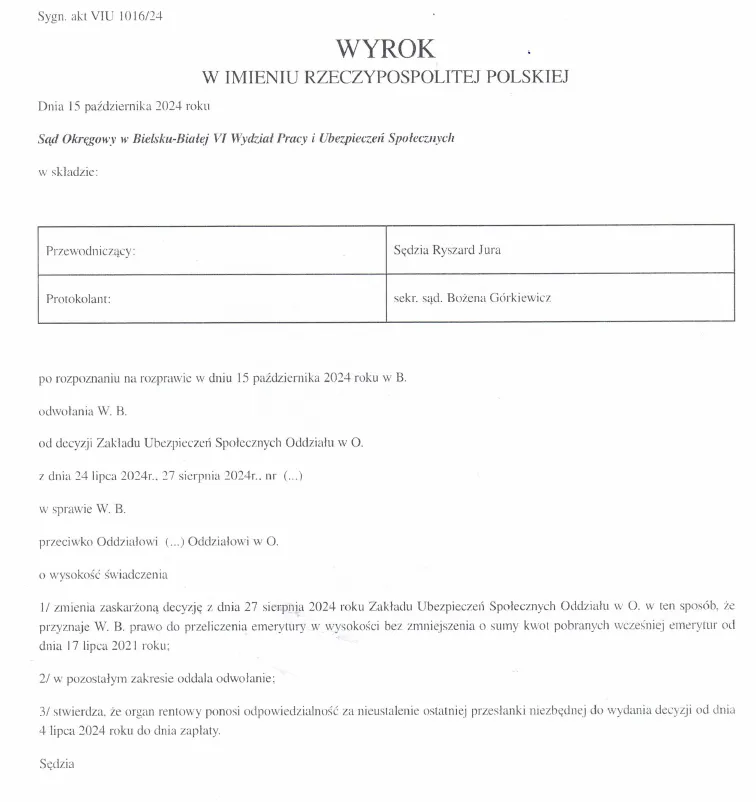 Sąd Okręgowy zrealizował wyrok TK z 4 czerwca 2024 r., ale tylko za 3 lata wstecz. I uznał za bez znaczenia prawnego brak publikacji tego wyroku w Dzienniku Ustaw. Link do wyroku Trybunału Konstytucyjnego (Link do wyroku TK i uzasadnienia) -