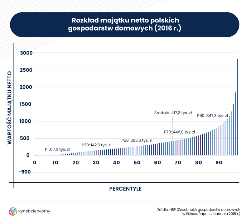 Wykres bazujący na wynikach badania NBP sugeruje, że majątek netto 10% najmniej zamożnych rodzin i singli w 2016 r. nie przekraczał 7900 zł. Jeżeli chodzi o 30% mało zamożnych gospodarstw domowych, to analogiczny wynik kształtował się na poziomie 142 300 zł. Pięćdziesiąty percentyl na poniższym wykresie stanowi medianę, czyli przeciętną wartość majątku netto polskich gospodarstw domowych sprzed 4 lat. Mowa o kwocie wynoszącej 263 600 zł. Wartość średnia z 2016 r. była natomiast znacznie wyższa i wynosiła 417 300 zł. Trudno się temu dziwić, bo rozkład majątku netto na wykresie jest mocno niesymetryczny. Co ciekawe, cztery lata temu kwota niewiele większa od średniej (446 800 zł majątku netto) wystarczała już do zakwalifikowania się do grupy 30% najzamożniejszych gospodarstw domowych.